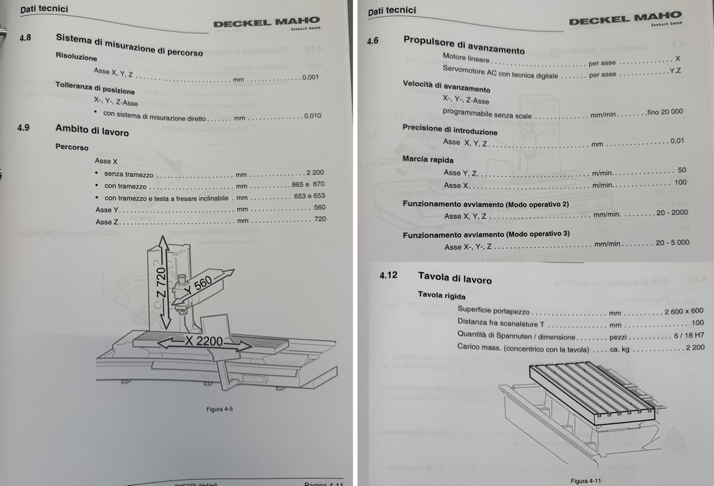 Corse assi x 2.200 (oppure 2 aree da 850mm cad. con paratia installata), y 560, z 720 mm, con una tavola portapezzo da 2.600x600mm con portata fino a 2.200 Kg. ed una tavola rotante (con possibilità di montaggio sia in verticale che in orizzontale) dal diametro di 550mm; movimento ASSE-B (testa tiltante): +/-100° in continuo, movimento ASSE-C: 360° in continuo, cnc HEIDENHAIN i-TNC 530, anno di costruzione 2007, a norme CE.