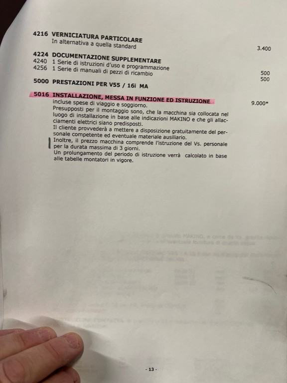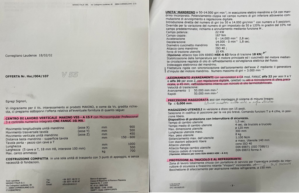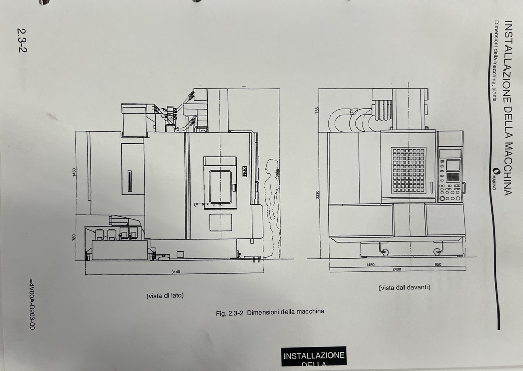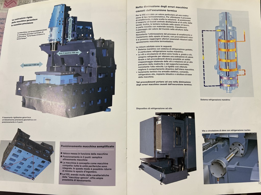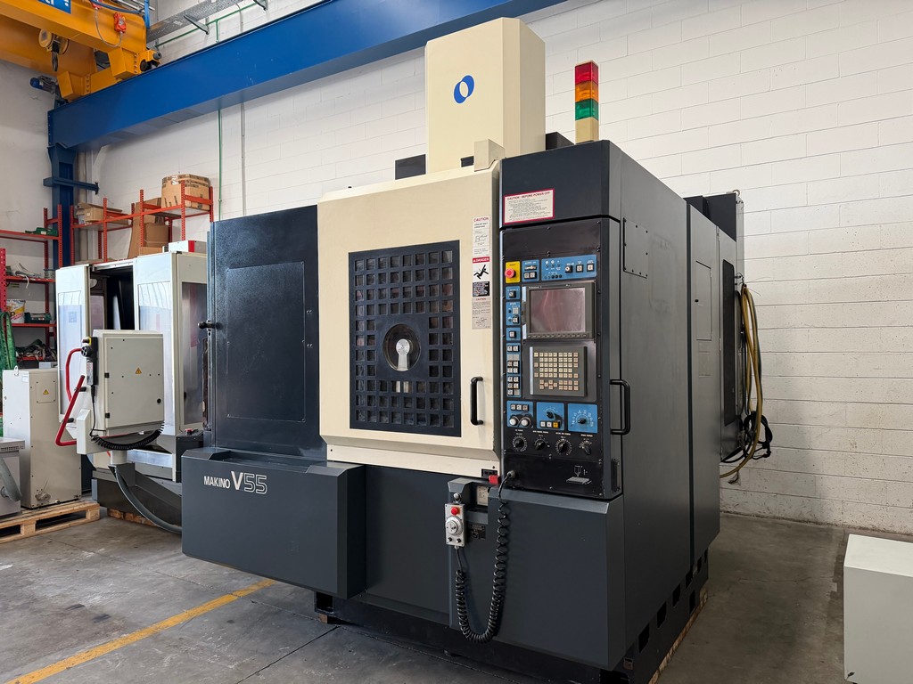 Il centro di lavoro verticale ad alta velocità MAKINO V55 usato è una macchina a controllo numerico di dimensioni medie con struttura in granito a portale (di tipo gantry), peso 9.300Kg; corse X 900, Y 500, Z 450 mm, dimensioni tavola 1000×500 con 700Kg di carico con avanzamento sia in rapido che in lavorazione fino a 50 mt/min con un accelerazione assi di 0.6G.