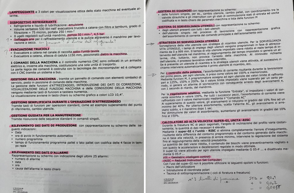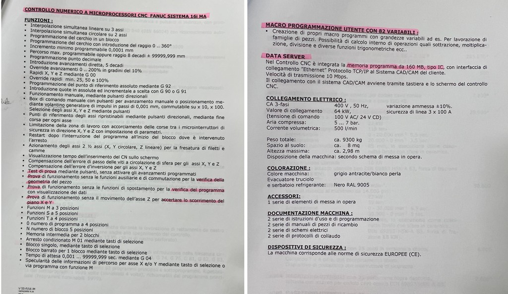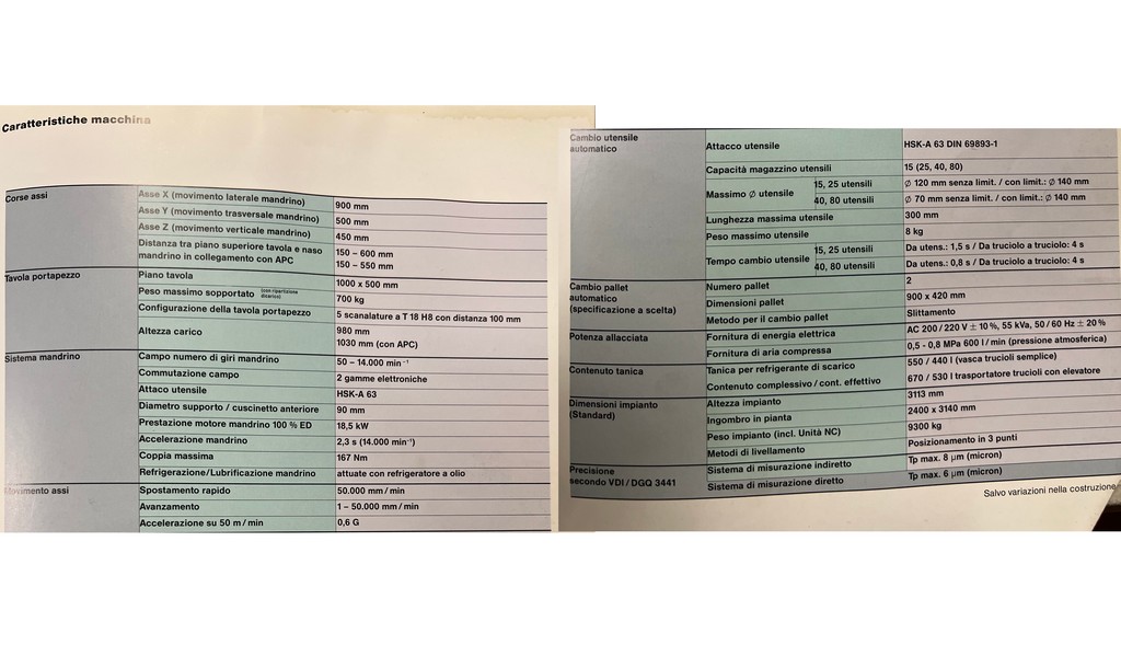 dotata di struttura in ghisa con appoggio su 3 punti per una migliore compensazione termica, cnc FANUC Professional 3 con lcd a colori, elettromandrino HSK 63A a 20.000 (max 22KW) raffreddato da apposito frigorifero, cambio utensili di tipo pick-up da 25 posizioni e volantino remotato.