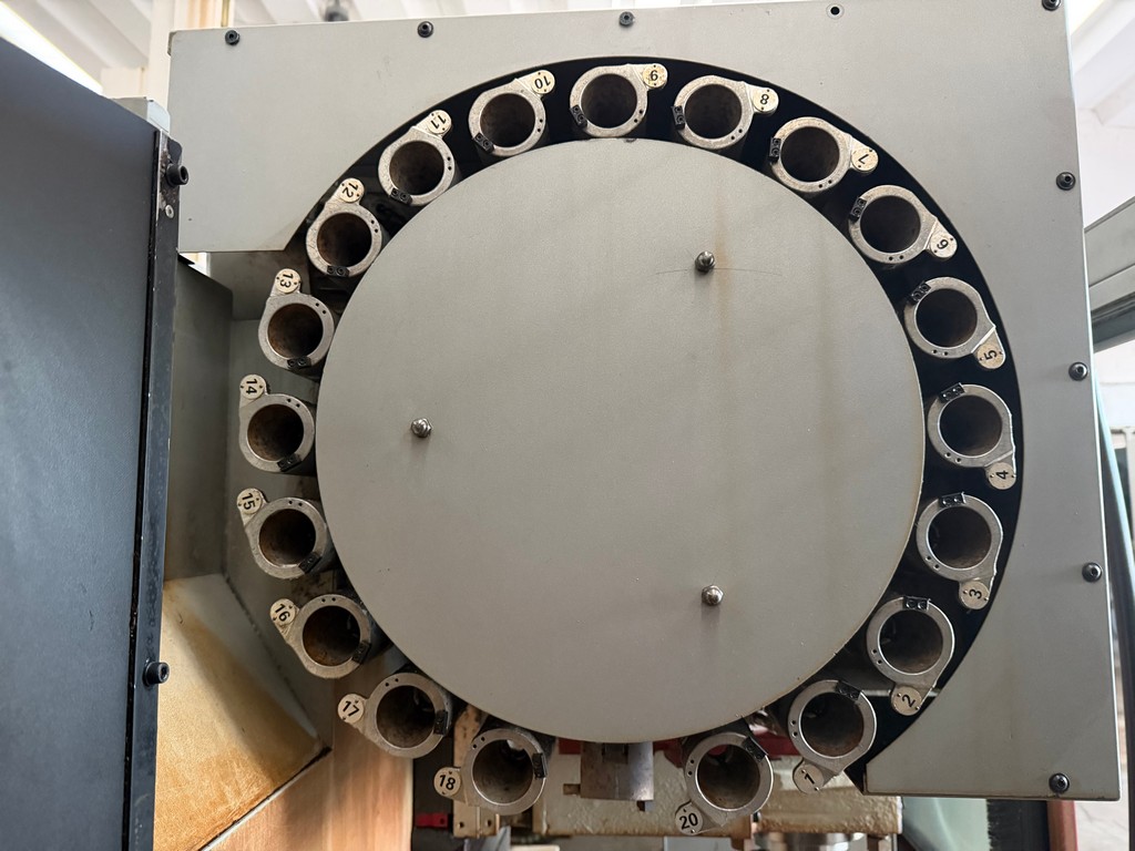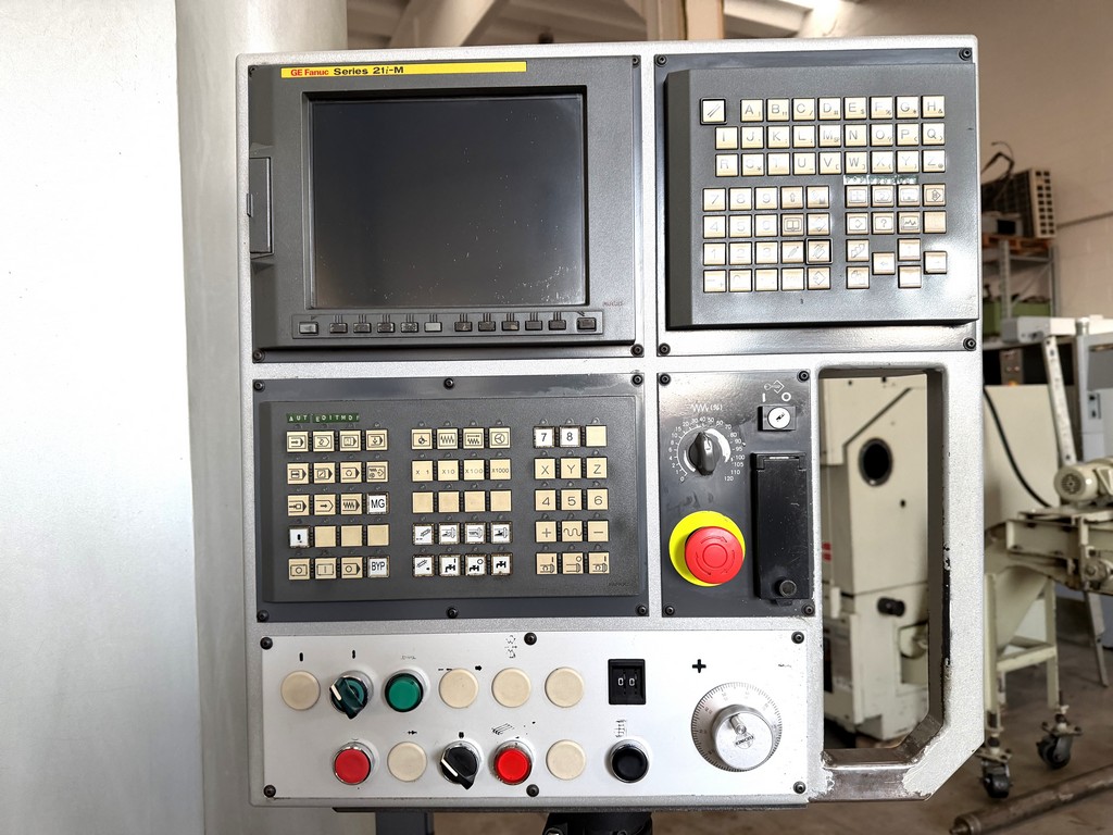 Il centro di lavoro verticale pendolare EIKON MV2 usato è un centro verticale a controllo numerico di piccole dimensioni con cnc FANUC 21i-M, mandrino ISO 40 din 69871 a 12.000 giri, cambio utensili random a 20 posizioni, evacuatore trucioli a tappeto, refrigerazione ad alta pressione attraverso il mandrino e paratia per lavorazioni in pendolare.