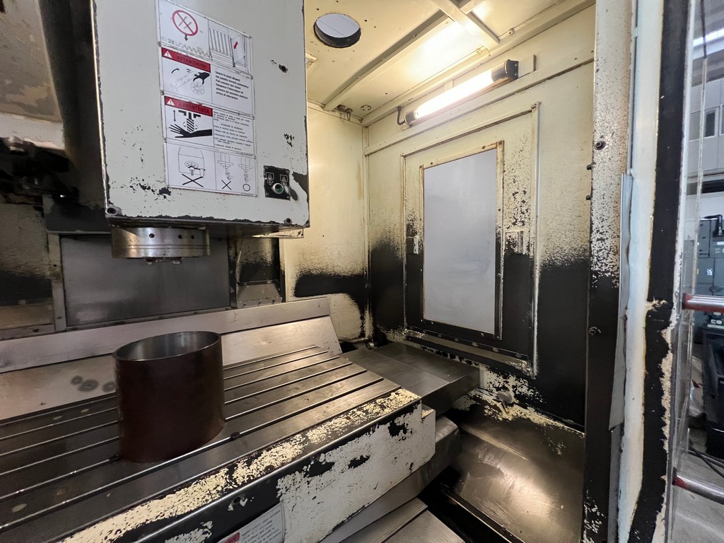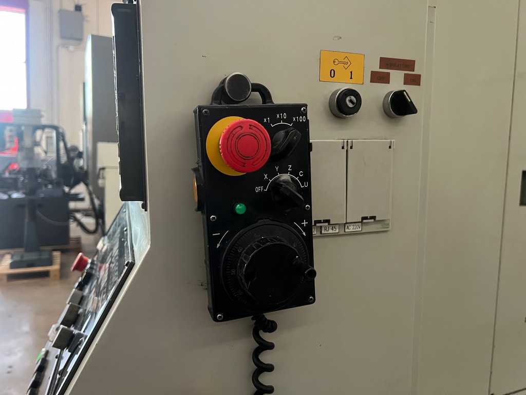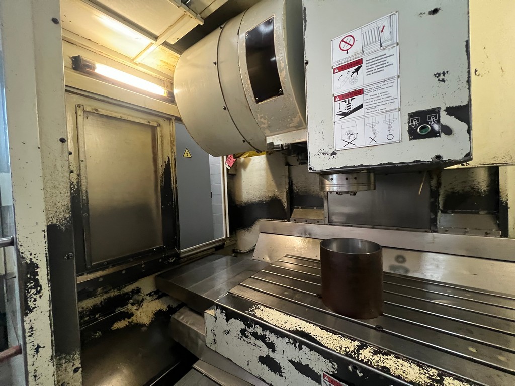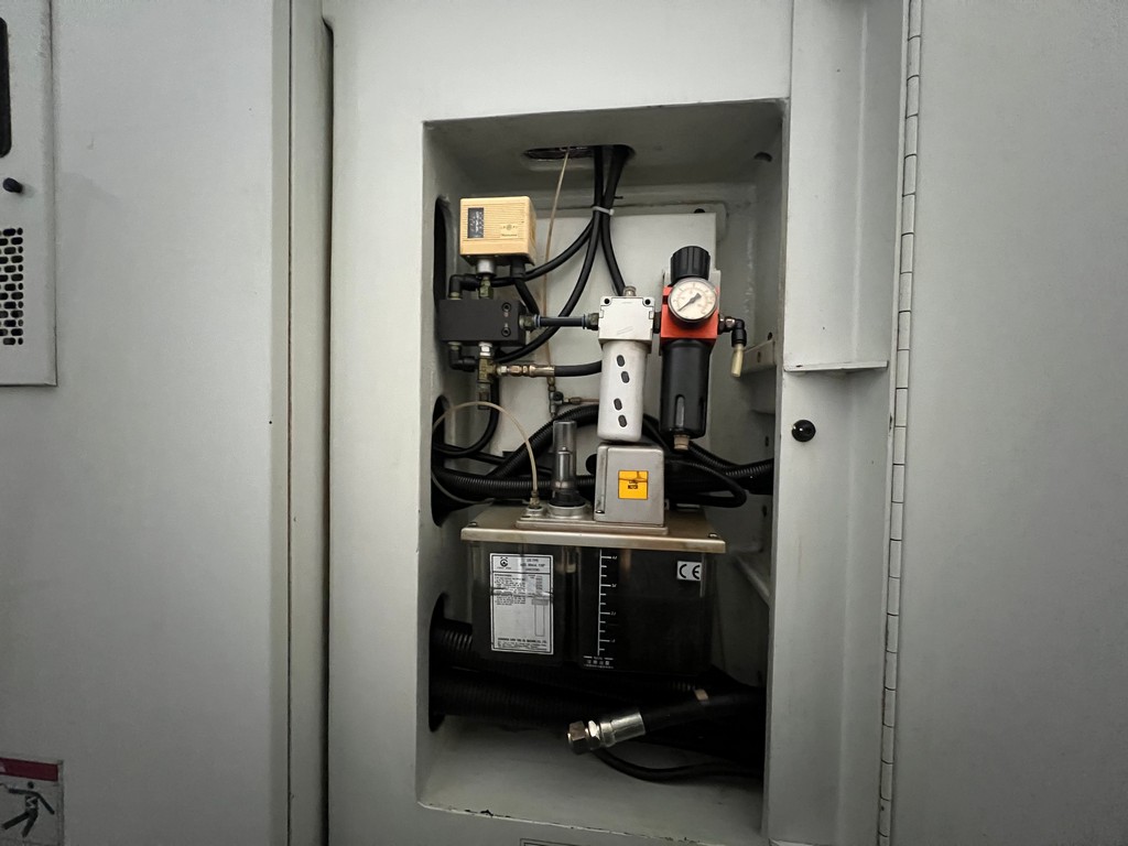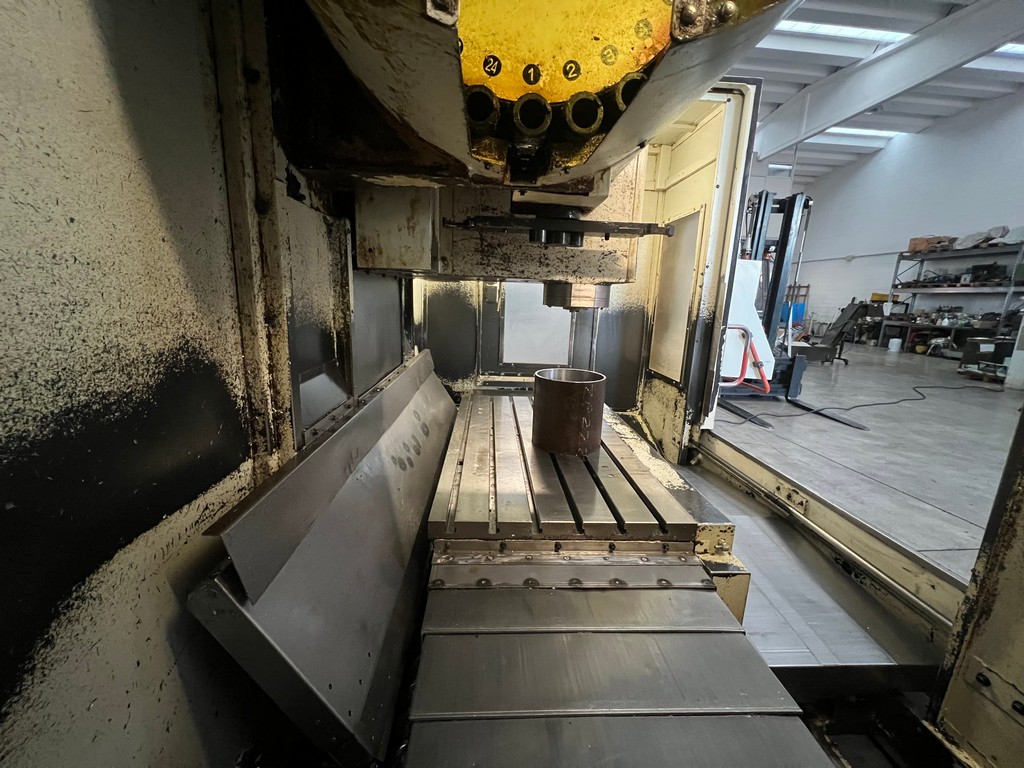 Mandrino BT-40 a 10.000 rpm (max 15KW) raffreddato da apposito frigorifero, refrigerazione ad alta pressione attraverso il mandrino, cambio utensili RANDOM a braccio di scambio da 24 posizioni ed evacuatore trucioli a tappeto.