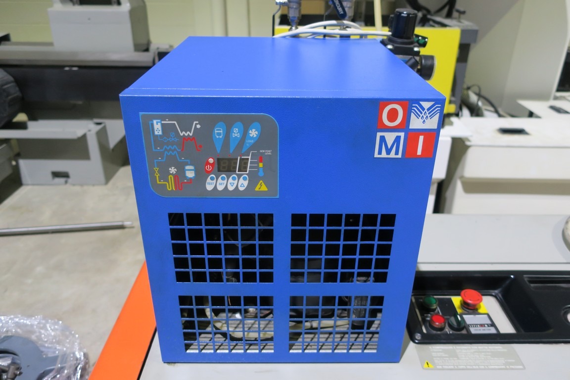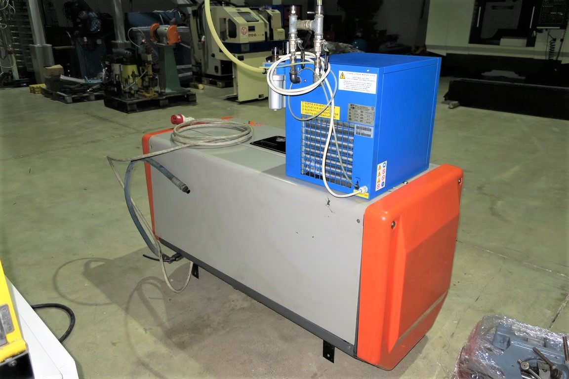 Il compressore rotativo a palette silenziato MATTEI KIT 507L usato è un compressore rotativo con una potenza di 7.5Kw (11CV), a norme “CE”, massima pressione di lavoro 8 bar, portata 1.150 lt/min, alimentazione 380V trifase, è dotato di essiccatore aria a refrigerazione OMI