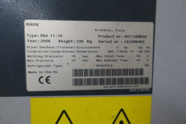Il compressore rotativo usato MARK 11 è un compressore usato silenziato rotativo a vite con una potenza di 11Kw, anno di costruzione 2008, a norme CE.