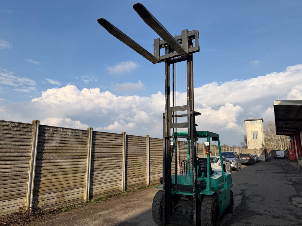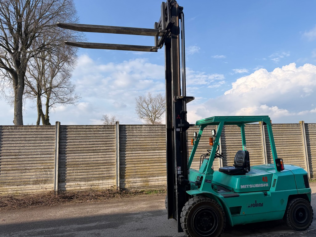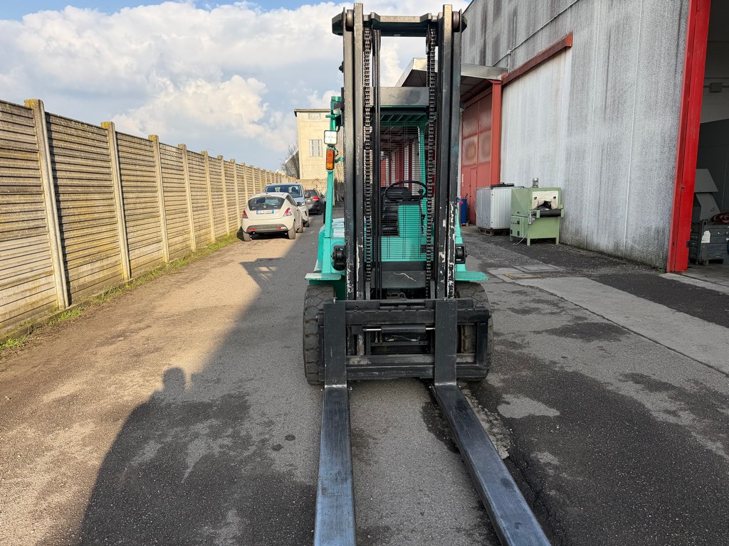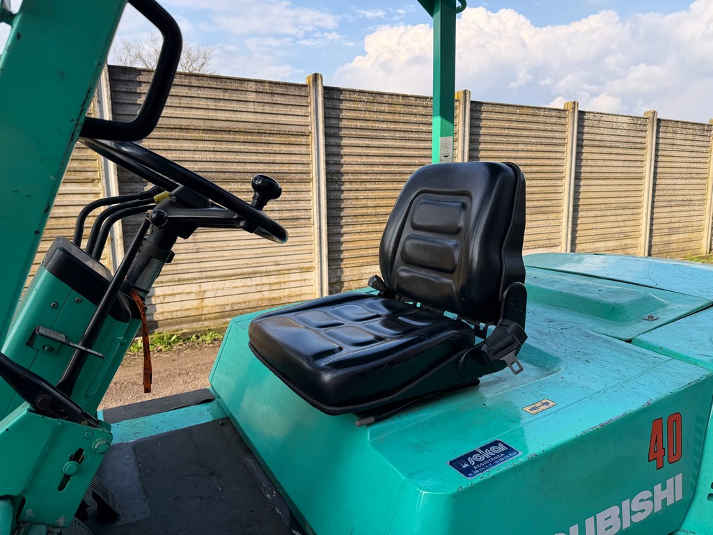 Il muletto a gasolio MITSUBISHI FD40 usato è un carrello elevatore diesel di costruzione Giapponese, uomo a bordo, 4 ruote, portata 4.000 kg., alzata massima 4.000 mm, dotato di traslatore, prolunghe per forche, fari anteriori, posteriori e frecce.