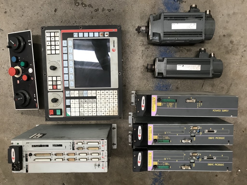 Il pacchetto cnc e azionamenti FAGOR 8055T usato è un impianto completo di controllo numerico, motori, azionamenti ed alimentatori smontato da un tornio a controllo numerico funzionante.