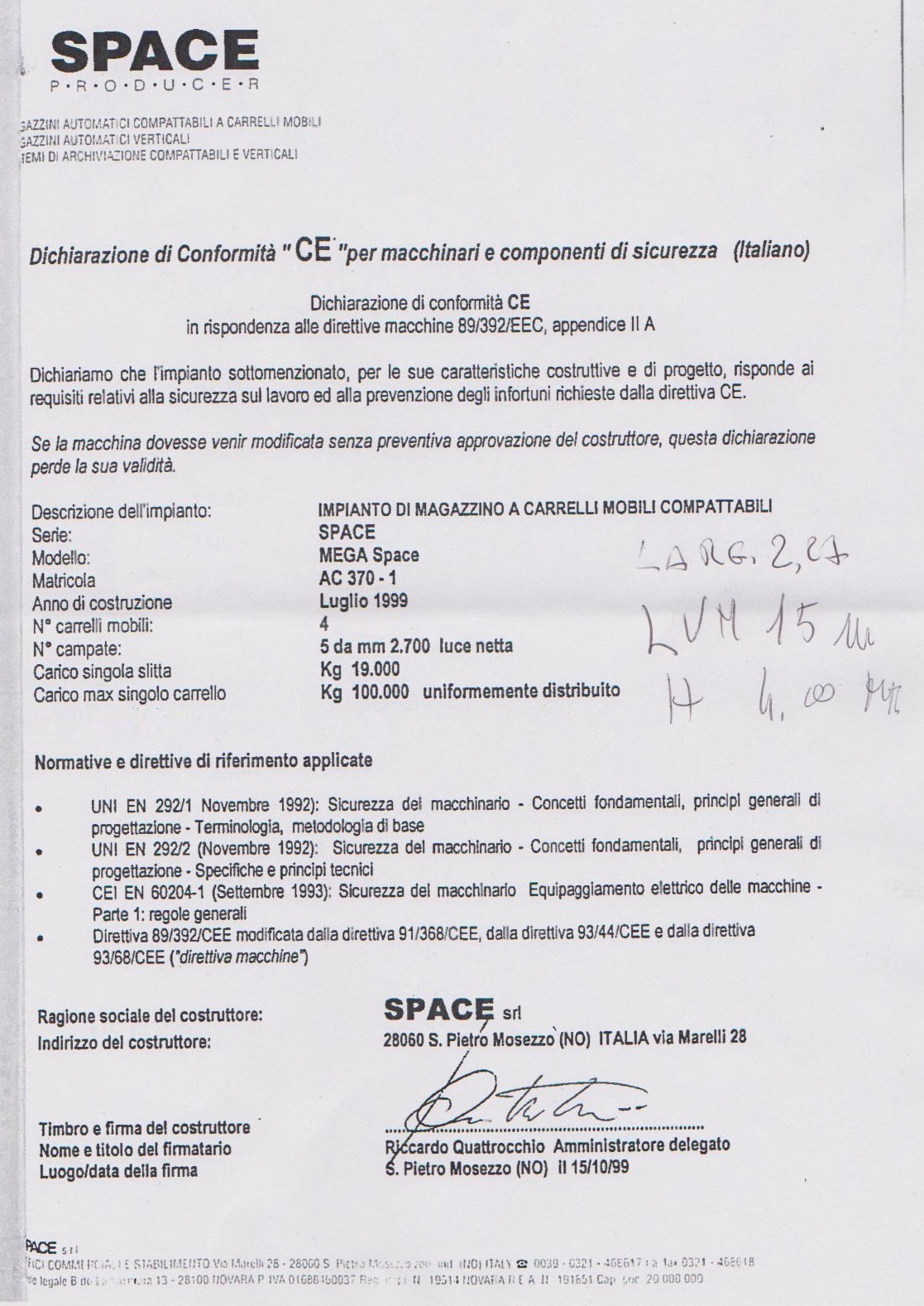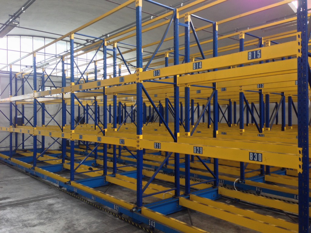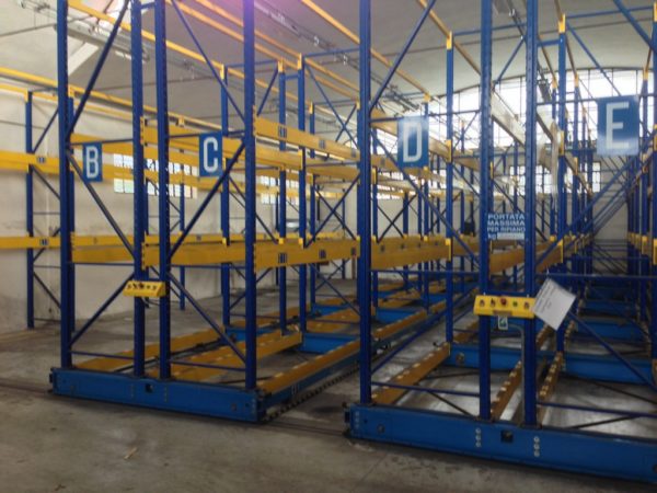 4 campate mobili doppie per una capienza 90 bancali cad. disposti su 3 livelli, lunghezza 15mt. larghezza 2.3mt. altezza 4mt;