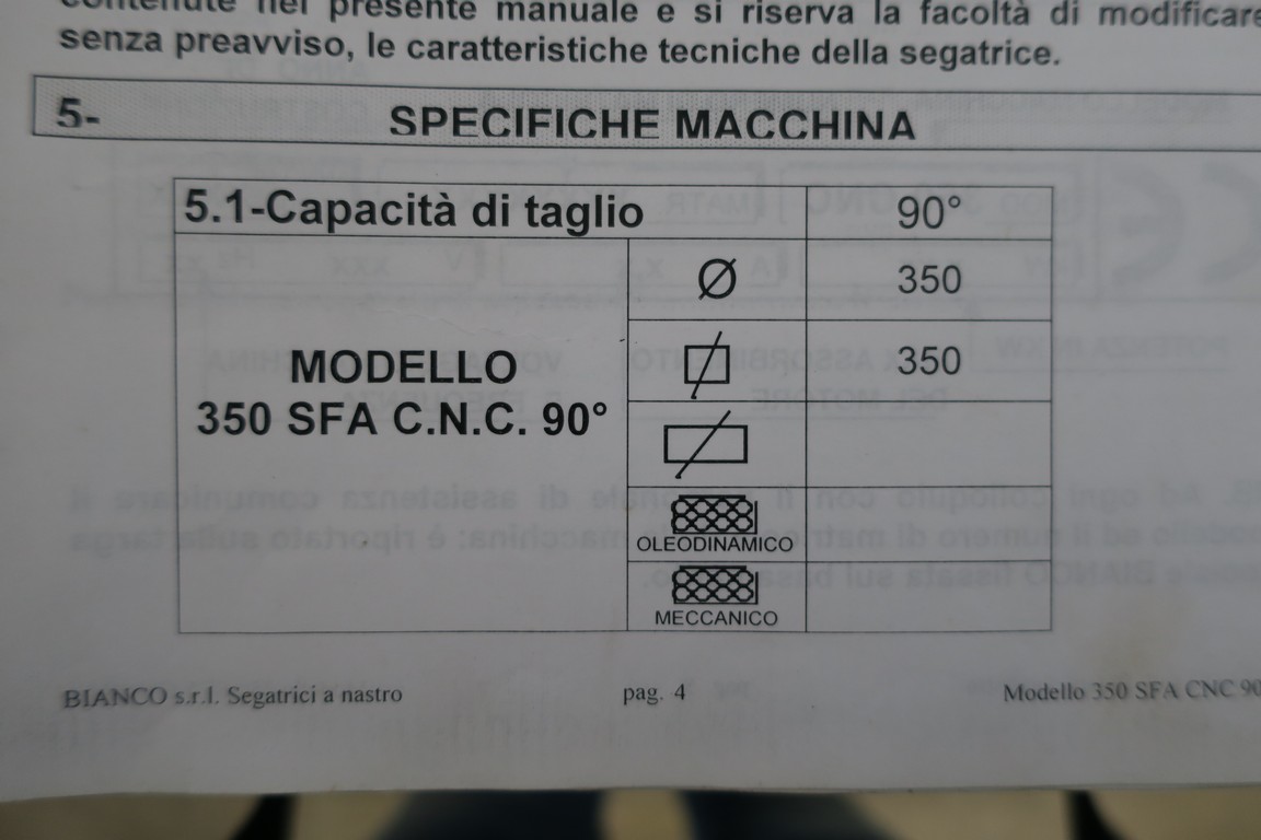 La segatrice a nastro automatica BIANCO 350 SFA CNC 90 usata REVISIONATA è una segatrice a controllo numerico di medie dimensioni con controllo numerico per la gestione in automatico dei lavori di taglio fino a 350mm di diametro e di quadro; ANNO 2004, norme CE, totalmente revisionata