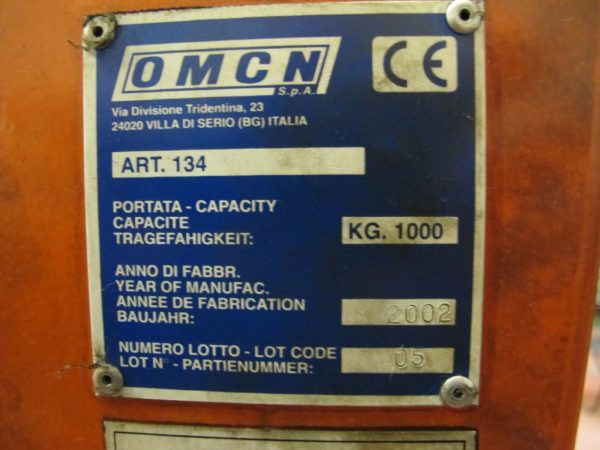 N 1 sollevatore a capretta OMCN art. 134 portata 1.000 Kg. anno 2002, norme CE