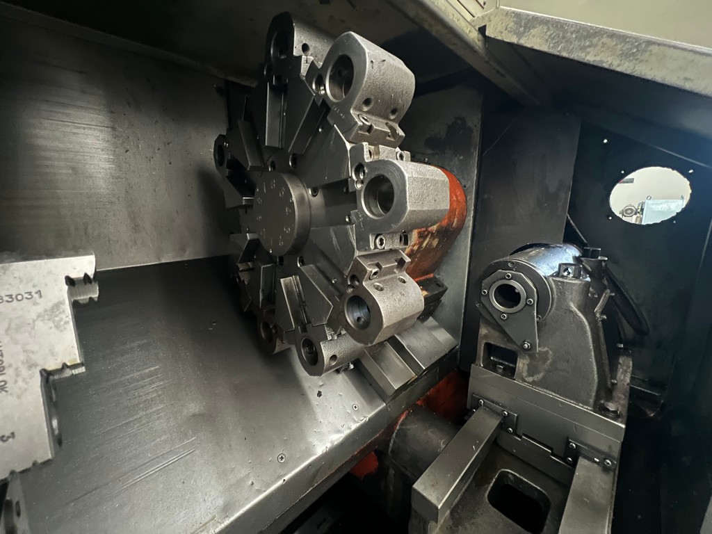 Completano la dotazione, la contropunta con canotto in ciclo, la manina scarico pezzi, l’evacuatore trucioli a tappeto, il presetting utensili, l’autocentrante a 3 griffe da 250mm e i manuali di uso e manutenzione.